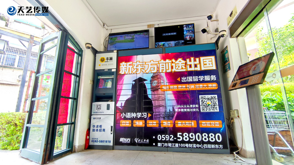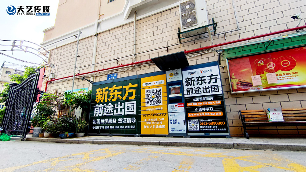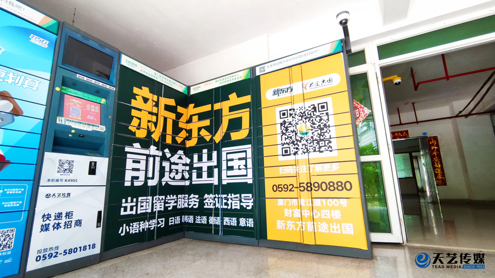 廈門新東方前途出國服務(wù)機構(gòu)位于鷺江道財務(wù)中心四樓,與廈門天藝傳媒合作,目前在主干道路名牌與生活小區(qū)的快遞柜媒體進(jìn)行部分宣傳合作。