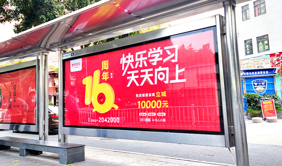 快樂學(xué)習(xí)作為廈門本土知名教育企業(yè),候車亭范圍覆蓋中小學(xué)周邊,讓學(xué)生和家長近距離感受戶外廣告畫面效果。